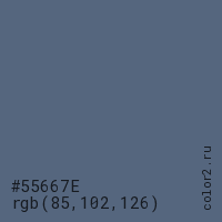 Цвет #55667E в цветовой модели RGB обозначается тремя октетами (85, 102, 126) в десятичном формате и #55667E в шестнадцатиричном (hex) формате, которые являются интенсивностью красного 85 (hex 55), интенсивность зелёного 102 (hex 66) и интенсивность синего 126 (hex 7E).