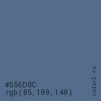Цвет #556D8C в цветовой модели RGB обозначается тремя октетами (85, 109, 140) в десятичном формате и #556D8C в шестнадцатиричном (hex) формате, которые являются интенсивностью красного 85 (hex 55), интенсивность зелёного 109 (hex 6D) и интенсивность синего 140 (hex 8C).