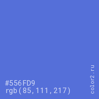 Цвет #556FD9 в цветовой модели RGB обозначается тремя октетами (85, 111, 217) в десятичном формате и #556FD9 в шестнадцатиричном (hex) формате, которые являются интенсивностью красного 85 (hex 55), интенсивность зелёного 111 (hex 6F) и интенсивность синего 217 (hex D9).