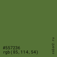 Цвет #557236 в цветовой модели RGB обозначается тремя октетами (85, 114, 54) в десятичном формате и #557236 в шестнадцатиричном (hex) формате, которые являются интенсивностью красного 85 (hex 55), интенсивность зелёного 114 (hex 72) и интенсивность синего 54 (hex 36).