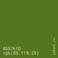 Цвет #55761D в цветовой модели RGB обозначается тремя октетами (85, 118, 29) в десятичном формате и #55761D в шестнадцатиричном (hex) формате, которые являются интенсивностью красного 85 (hex 55), интенсивность зелёного 118 (hex 76) и интенсивность синего 29 (hex 1D).
