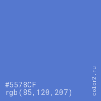 Цвет #5578CF в цветовой модели RGB обозначается тремя октетами (85, 120, 207) в десятичном формате и #5578CF в шестнадцатиричном (hex) формате, которые являются интенсивностью красного 85 (hex 55), интенсивность зелёного 120 (hex 78) и интенсивность синего 207 (hex CF).