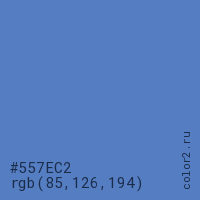 Цвет #557EC2 в цветовой модели RGB обозначается тремя октетами (85, 126, 194) в десятичном формате и #557EC2 в шестнадцатиричном (hex) формате, которые являются интенсивностью красного 85 (hex 55), интенсивность зелёного 126 (hex 7E) и интенсивность синего 194 (hex C2).