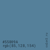 Цвет #55809A в цветовой модели RGB обозначается тремя октетами (85, 128, 154) в десятичном формате и #55809A в шестнадцатиричном (hex) формате, которые являются интенсивностью красного 85 (hex 55), интенсивность зелёного 128 (hex 80) и интенсивность синего 154 (hex 9A).