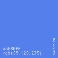 Цвет #5580EB в цветовой модели RGB обозначается тремя октетами (85, 128, 235) в десятичном формате и #5580EB в шестнадцатиричном (hex) формате, которые являются интенсивностью красного 85 (hex 55), интенсивность зелёного 128 (hex 80) и интенсивность синего 235 (hex EB).
