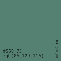Цвет #558173 в цветовой модели RGB обозначается тремя октетами (85, 129, 115) в десятичном формате и #558173 в шестнадцатиричном (hex) формате, которые являются интенсивностью красного 85 (hex 55), интенсивность зелёного 129 (hex 81) и интенсивность синего 115 (hex 73).