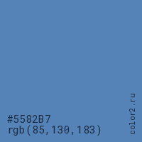Цвет #5582B7 в цветовой модели RGB обозначается тремя октетами (85, 130, 183) в десятичном формате и #5582B7 в шестнадцатиричном (hex) формате, которые являются интенсивностью красного 85 (hex 55), интенсивность зелёного 130 (hex 82) и интенсивность синего 183 (hex B7).