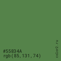 Цвет #55834A в цветовой модели RGB обозначается тремя октетами (85, 131, 74) в десятичном формате и #55834A в шестнадцатиричном (hex) формате, которые являются интенсивностью красного 85 (hex 55), интенсивность зелёного 131 (hex 83) и интенсивность синего 74 (hex 4A).
