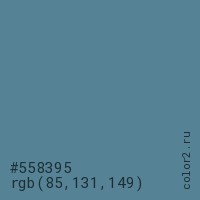 Цвет #558395 в цветовой модели RGB обозначается тремя октетами (85, 131, 149) в десятичном формате и #558395 в шестнадцатиричном (hex) формате, которые являются интенсивностью красного 85 (hex 55), интенсивность зелёного 131 (hex 83) и интенсивность синего 149 (hex 95).