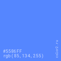 Цвет #5586FF в цветовой модели RGB обозначается тремя октетами (85, 134, 255) в десятичном формате и #5586FF в шестнадцатиричном (hex) формате, которые являются интенсивностью красного 85 (hex 55), интенсивность зелёного 134 (hex 86) и интенсивность синего 255 (hex FF).