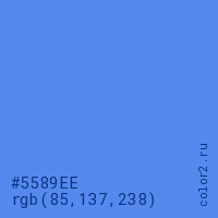 Цвет #5589EE в цветовой модели RGB обозначается тремя октетами (85, 137, 238) в десятичном формате и #5589EE в шестнадцатиричном (hex) формате, которые являются интенсивностью красного 85 (hex 55), интенсивность зелёного 137 (hex 89) и интенсивность синего 238 (hex EE).