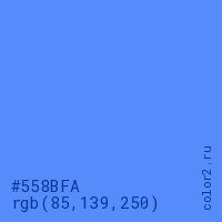 Цвет #558BFA в цветовой модели RGB обозначается тремя октетами (85, 139, 250) в десятичном формате и #558BFA в шестнадцатиричном (hex) формате, которые являются интенсивностью красного 85 (hex 55), интенсивность зелёного 139 (hex 8B) и интенсивность синего 250 (hex FA).