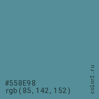 Цвет #558E98 в цветовой модели RGB обозначается тремя октетами (85, 142, 152) в десятичном формате и #558E98 в шестнадцатиричном (hex) формате, которые являются интенсивностью красного 85 (hex 55), интенсивность зелёного 142 (hex 8E) и интенсивность синего 152 (hex 98).