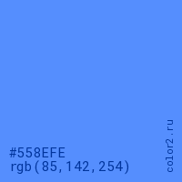 Цвет #558EFE в цветовой модели RGB обозначается тремя октетами (85, 142, 254) в десятичном формате и #558EFE в шестнадцатиричном (hex) формате, которые являются интенсивностью красного 85 (hex 55), интенсивность зелёного 142 (hex 8E) и интенсивность синего 254 (hex FE).