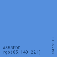 Цвет #558FDD в цветовой модели RGB обозначается тремя октетами (85, 143, 221) в десятичном формате и #558FDD в шестнадцатиричном (hex) формате, которые являются интенсивностью красного 85 (hex 55), интенсивность зелёного 143 (hex 8F) и интенсивность синего 221 (hex DD).