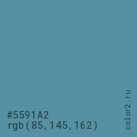 Цвет #5591A2 в цветовой модели RGB обозначается тремя октетами (85, 145, 162) в десятичном формате и #5591A2 в шестнадцатиричном (hex) формате, которые являются интенсивностью красного 85 (hex 55), интенсивность зелёного 145 (hex 91) и интенсивность синего 162 (hex A2).