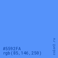 Цвет #5592FA в цветовой модели RGB обозначается тремя октетами (85, 146, 250) в десятичном формате и #5592FA в шестнадцатиричном (hex) формате, которые являются интенсивностью красного 85 (hex 55), интенсивность зелёного 146 (hex 92) и интенсивность синего 250 (hex FA).