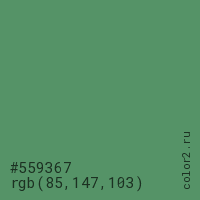 Цвет #559367 в цветовой модели RGB обозначается тремя октетами (85, 147, 103) в десятичном формате и #559367 в шестнадцатиричном (hex) формате, которые являются интенсивностью красного 85 (hex 55), интенсивность зелёного 147 (hex 93) и интенсивность синего 103 (hex 67).