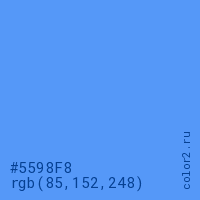 Цвет #5598F8 в цветовой модели RGB обозначается тремя октетами (85, 152, 248) в десятичном формате и #5598F8 в шестнадцатиричном (hex) формате, которые являются интенсивностью красного 85 (hex 55), интенсивность зелёного 152 (hex 98) и интенсивность синего 248 (hex F8).