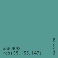 Цвет #559B93 в цветовой модели RGB обозначается тремя октетами (85, 155, 147) в десятичном формате и #559B93 в шестнадцатиричном (hex) формате, которые являются интенсивностью красного 85 (hex 55), интенсивность зелёного 155 (hex 9B) и интенсивность синего 147 (hex 93).