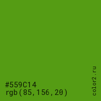 Цвет #559C14 в цветовой модели RGB обозначается тремя октетами (85, 156, 20) в десятичном формате и #559C14 в шестнадцатиричном (hex) формате, которые являются интенсивностью красного 85 (hex 55), интенсивность зелёного 156 (hex 9C) и интенсивность синего 20 (hex 14).