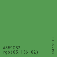 Цвет #559C52 в цветовой модели RGB обозначается тремя октетами (85, 156, 82) в десятичном формате и #559C52 в шестнадцатиричном (hex) формате, которые являются интенсивностью красного 85 (hex 55), интенсивность зелёного 156 (hex 9C) и интенсивность синего 82 (hex 52).