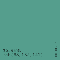 Цвет #559E8D в цветовой модели RGB обозначается тремя октетами (85, 158, 141) в десятичном формате и #559E8D в шестнадцатиричном (hex) формате, которые являются интенсивностью красного 85 (hex 55), интенсивность зелёного 158 (hex 9E) и интенсивность синего 141 (hex 8D).