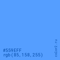 Цвет #559EFF в цветовой модели RGB обозначается тремя октетами (85, 158, 255) в десятичном формате и #559EFF в шестнадцатиричном (hex) формате, которые являются интенсивностью красного 85 (hex 55), интенсивность зелёного 158 (hex 9E) и интенсивность синего 255 (hex FF).