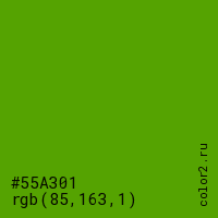 Цвет #55A301 в цветовой модели RGB обозначается тремя октетами (85, 163, 1) в десятичном формате и #55A301 в шестнадцатиричном (hex) формате, которые являются интенсивностью красного 85 (hex 55), интенсивность зелёного 163 (hex A3) и интенсивность синего 1 (hex 01).