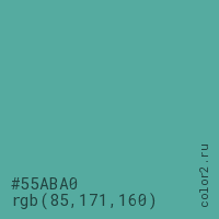 Цвет #55ABA0 в цветовой модели RGB обозначается тремя октетами (85, 171, 160) в десятичном формате и #55ABA0 в шестнадцатиричном (hex) формате, которые являются интенсивностью красного 85 (hex 55), интенсивность зелёного 171 (hex AB) и интенсивность синего 160 (hex A0).