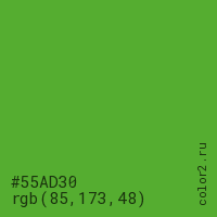 Цвет #55AD30 в цветовой модели RGB обозначается тремя октетами (85, 173, 48) в десятичном формате и #55AD30 в шестнадцатиричном (hex) формате, которые являются интенсивностью красного 85 (hex 55), интенсивность зелёного 173 (hex AD) и интенсивность синего 48 (hex 30).
