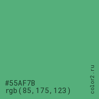 Цвет #55AF7B в цветовой модели RGB обозначается тремя октетами (85, 175, 123) в десятичном формате и #55AF7B в шестнадцатиричном (hex) формате, которые являются интенсивностью красного 85 (hex 55), интенсивность зелёного 175 (hex AF) и интенсивность синего 123 (hex 7B).
