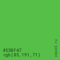 Цвет #55BF47 в цветовой модели RGB обозначается тремя октетами (85, 191, 71) в десятичном формате и #55BF47 в шестнадцатиричном (hex) формате, которые являются интенсивностью красного 85 (hex 55), интенсивность зелёного 191 (hex BF) и интенсивность синего 71 (hex 47).