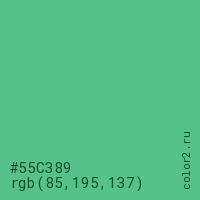 Цвет #55C389 в цветовой модели RGB обозначается тремя октетами (85, 195, 137) в десятичном формате и #55C389 в шестнадцатиричном (hex) формате, которые являются интенсивностью красного 85 (hex 55), интенсивность зелёного 195 (hex C3) и интенсивность синего 137 (hex 89).