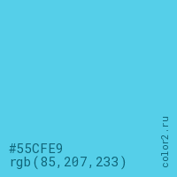 Цвет #55CFE9 в цветовой модели RGB обозначается тремя октетами (85, 207, 233) в десятичном формате и #55CFE9 в шестнадцатиричном (hex) формате, которые являются интенсивностью красного 85 (hex 55), интенсивность зелёного 207 (hex CF) и интенсивность синего 233 (hex E9).