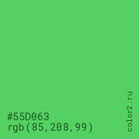 Цвет #55D063 в цветовой модели RGB обозначается тремя октетами (85, 208, 99) в десятичном формате и #55D063 в шестнадцатиричном (hex) формате, которые являются интенсивностью красного 85 (hex 55), интенсивность зелёного 208 (hex D0) и интенсивность синего 99 (hex 63).