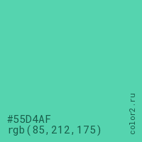 Цвет #55D4AF в цветовой модели RGB обозначается тремя октетами (85, 212, 175) в десятичном формате и #55D4AF в шестнадцатиричном (hex) формате, которые являются интенсивностью красного 85 (hex 55), интенсивность зелёного 212 (hex D4) и интенсивность синего 175 (hex AF).