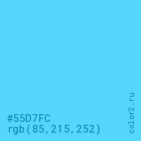 Цвет #55D7FC в цветовой модели RGB обозначается тремя октетами (85, 215, 252) в десятичном формате и #55D7FC в шестнадцатиричном (hex) формате, которые являются интенсивностью красного 85 (hex 55), интенсивность зелёного 215 (hex D7) и интенсивность синего 252 (hex FC).