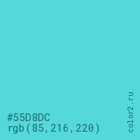Цвет #55D8DC в цветовой модели RGB обозначается тремя октетами (85, 216, 220) в десятичном формате и #55D8DC в шестнадцатиричном (hex) формате, которые являются интенсивностью красного 85 (hex 55), интенсивность зелёного 216 (hex D8) и интенсивность синего 220 (hex DC).