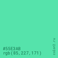 Цвет #55E3AB в цветовой модели RGB обозначается тремя октетами (85, 227, 171) в десятичном формате и #55E3AB в шестнадцатиричном (hex) формате, которые являются интенсивностью красного 85 (hex 55), интенсивность зелёного 227 (hex E3) и интенсивность синего 171 (hex AB).