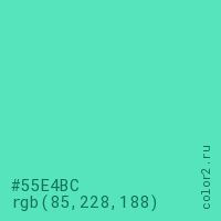 Цвет #55E4BC в цветовой модели RGB обозначается тремя октетами (85, 228, 188) в десятичном формате и #55E4BC в шестнадцатиричном (hex) формате, которые являются интенсивностью красного 85 (hex 55), интенсивность зелёного 228 (hex E4) и интенсивность синего 188 (hex BC).
