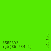 Цвет #55EA02 в цветовой модели RGB обозначается тремя октетами (85, 234, 2) в десятичном формате и #55EA02 в шестнадцатиричном (hex) формате, которые являются интенсивностью красного 85 (hex 55), интенсивность зелёного 234 (hex EA) и интенсивность синего 2 (hex 02).