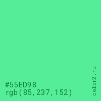 Цвет #55ED98 в цветовой модели RGB обозначается тремя октетами (85, 237, 152) в десятичном формате и #55ED98 в шестнадцатиричном (hex) формате, которые являются интенсивностью красного 85 (hex 55), интенсивность зелёного 237 (hex ED) и интенсивность синего 152 (hex 98).