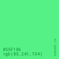 Цвет #55F186 в цветовой модели RGB обозначается тремя октетами (85, 241, 134) в десятичном формате и #55F186 в шестнадцатиричном (hex) формате, которые являются интенсивностью красного 85 (hex 55), интенсивность зелёного 241 (hex F1) и интенсивность синего 134 (hex 86).
