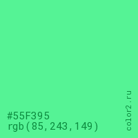 Цвет #55F395 в цветовой модели RGB обозначается тремя октетами (85, 243, 149) в десятичном формате и #55F395 в шестнадцатиричном (hex) формате, которые являются интенсивностью красного 85 (hex 55), интенсивность зелёного 243 (hex F3) и интенсивность синего 149 (hex 95).