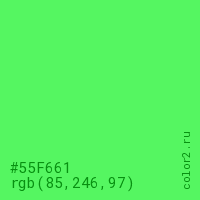 Цвет #55F661 в цветовой модели RGB обозначается тремя октетами (85, 246, 97) в десятичном формате и #55F661 в шестнадцатиричном (hex) формате, которые являются интенсивностью красного 85 (hex 55), интенсивность зелёного 246 (hex F6) и интенсивность синего 97 (hex 61).