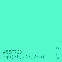 Цвет #55F7CD в цветовой модели RGB обозначается тремя октетами (85, 247, 205) в десятичном формате и #55F7CD в шестнадцатиричном (hex) формате, которые являются интенсивностью красного 85 (hex 55), интенсивность зелёного 247 (hex F7) и интенсивность синего 205 (hex CD).