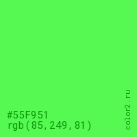 Цвет #55F951 в цветовой модели RGB обозначается тремя октетами (85, 249, 81) в десятичном формате и #55F951 в шестнадцатиричном (hex) формате, которые являются интенсивностью красного 85 (hex 55), интенсивность зелёного 249 (hex F9) и интенсивность синего 81 (hex 51).
