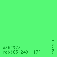 Цвет #55F975 в цветовой модели RGB обозначается тремя октетами (85, 249, 117) в десятичном формате и #55F975 в шестнадцатиричном (hex) формате, которые являются интенсивностью красного 85 (hex 55), интенсивность зелёного 249 (hex F9) и интенсивность синего 117 (hex 75).
