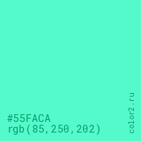 Цвет #55FACA в цветовой модели RGB обозначается тремя октетами (85, 250, 202) в десятичном формате и #55FACA в шестнадцатиричном (hex) формате, которые являются интенсивностью красного 85 (hex 55), интенсивность зелёного 250 (hex FA) и интенсивность синего 202 (hex CA).